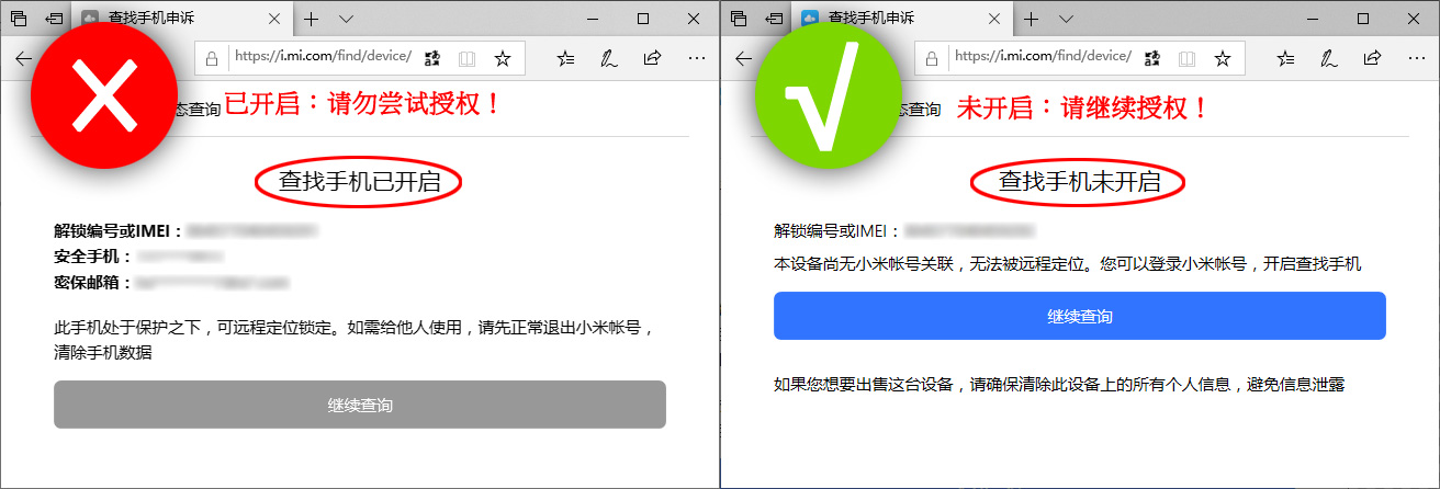 注:查询手机未开启请继续授权,查找手机已开启请勿尝试继续授权,否则会导致封号!!!